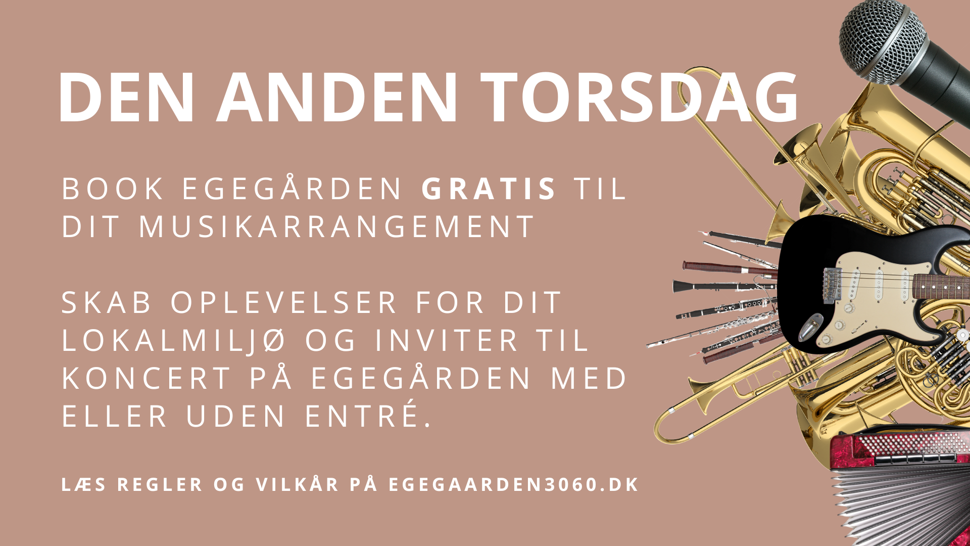 Book Egegården gratis til dit musikarrangement. Skab oplevelser for dit lokalmiljø og inviter til koncert på Egegården med eller uden entré.