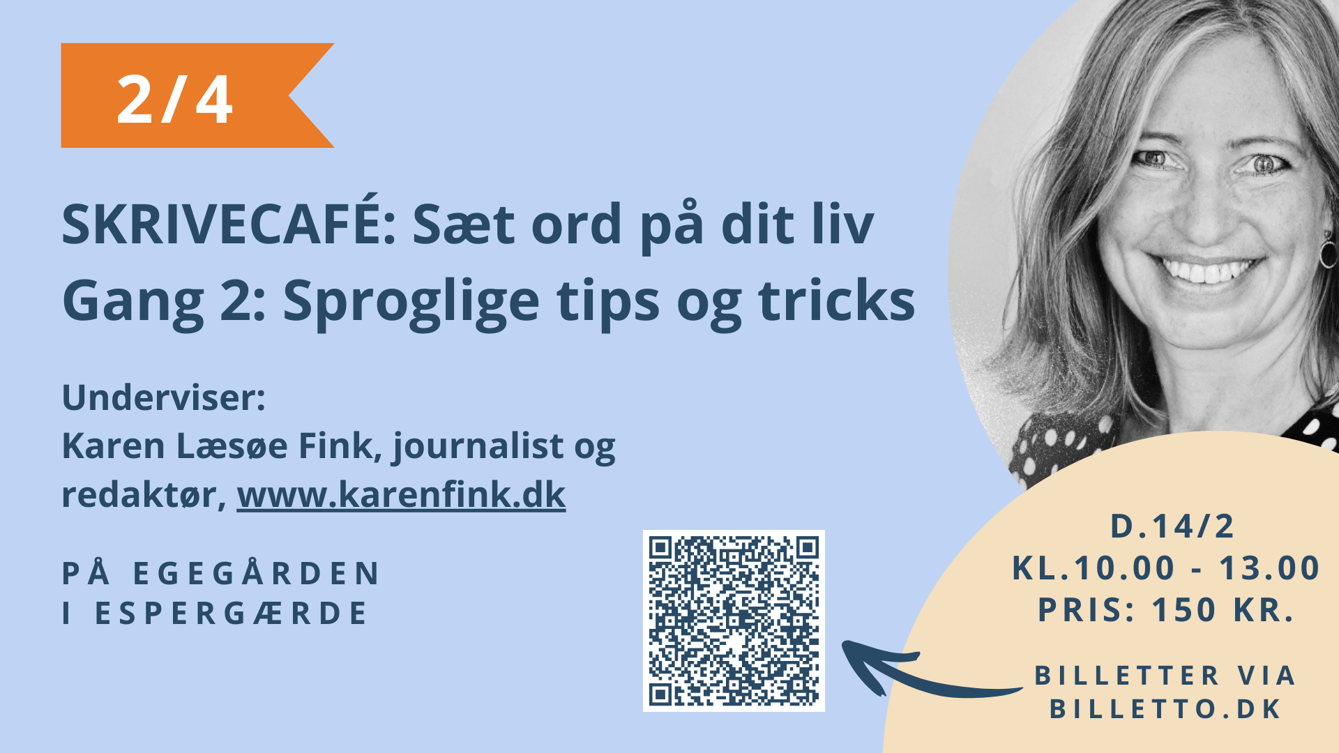 Du får et kort fagligt oplæg, efterfulgt af praksisnære øvelser, hvor du omsætter teknikkerne direkte i din egen tekst.